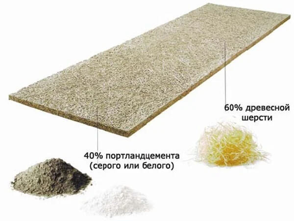 Фибролит состоит из 60% древесных длинных узких стружек (волокон), 39% неорганического вяжущего вещества - портландцемента (прочность камня), 1% раствора жидкого стекла (минерализатора).